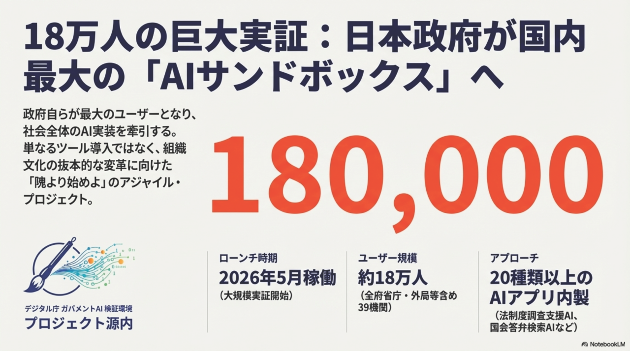 - 日本政府は国産AI基盤「源内」を全府省庁の約18万人の政府職員に展開する大規模実証を2026年5月から2027年3月まで実施します。