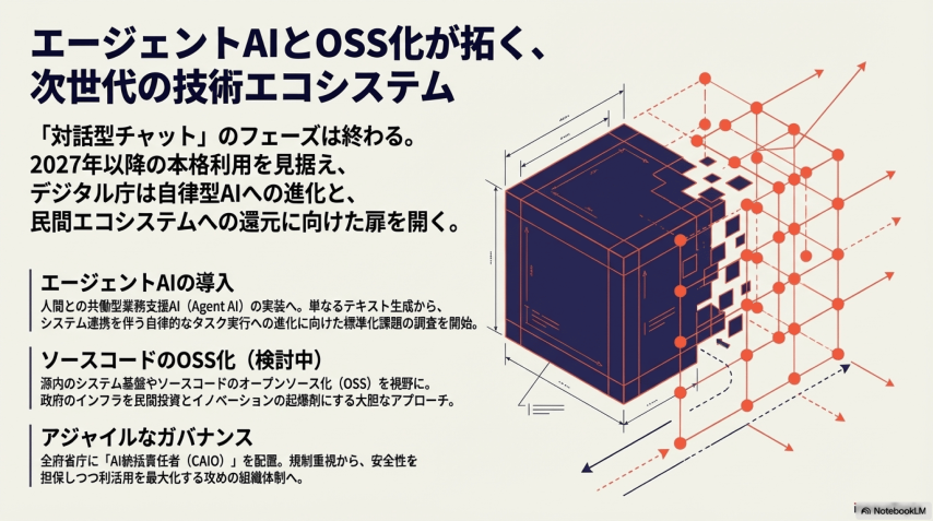 源内のソースコードをOSS(オープンソースソフトウェア)化する方針も検討中です。実現すれば、地方自治体や民間企業が同じ基盤を活用できるようになり、日本全体のAI活用インフラとして波及する可能性があります。これは単なる政府DXを超えた、 **AIエコシステム構築への布石** と見ることができます。