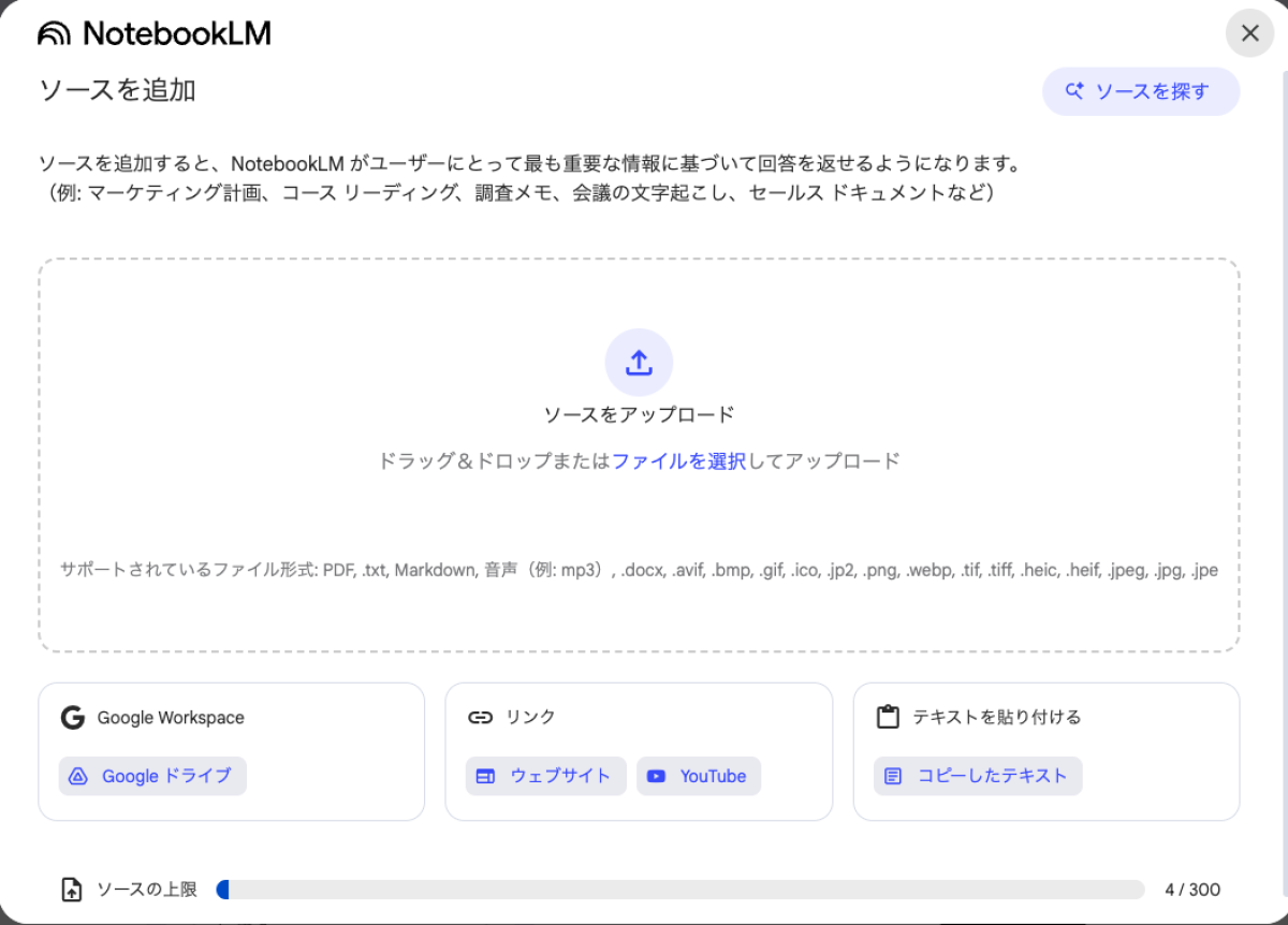 - **ソース追加機能**: PDF、テキスト、URL、Googleドキュメント、YouTube、音声ファイルなど多様な形式に対応。