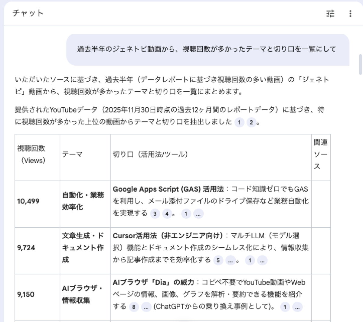 \- **ディープリサーチ** :いろんなキーワードで検索して情報を取ってきて、全部一気にソースとして追加