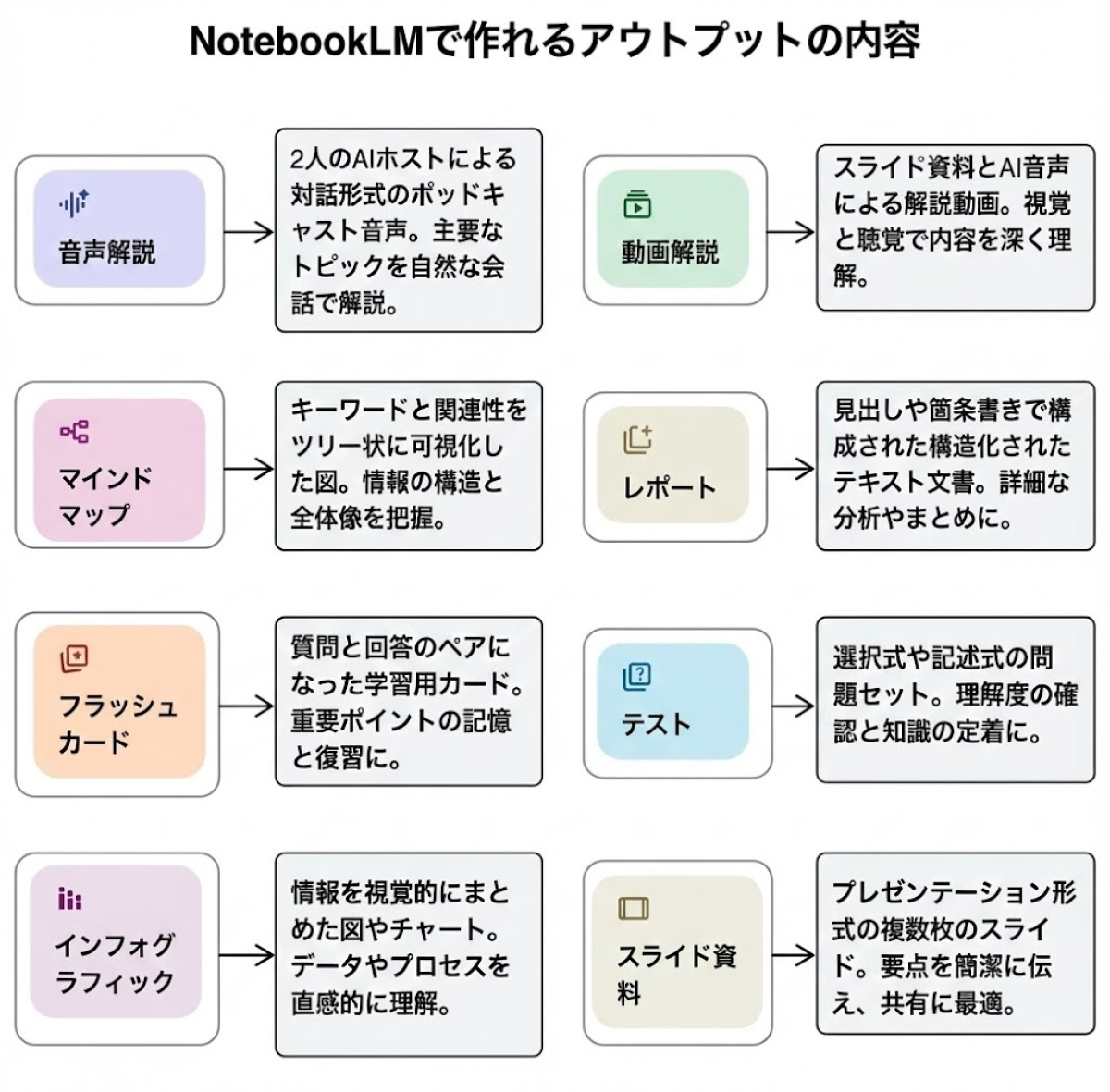 - 音声ポッドキャスト、動画解説、マインドマップ、レポート、クイズ・テスト、インフォグラフィック、スライド資料(NanobananaPro搭載で高品質化)。