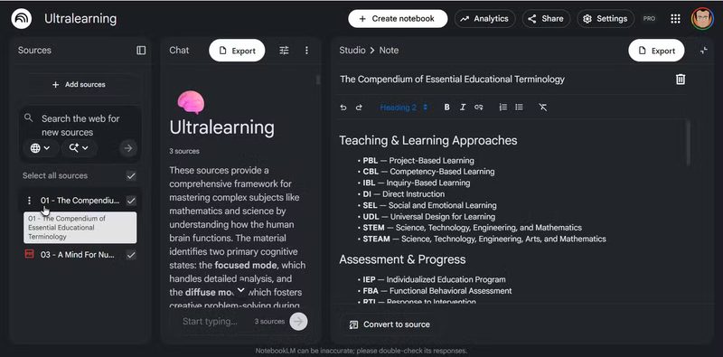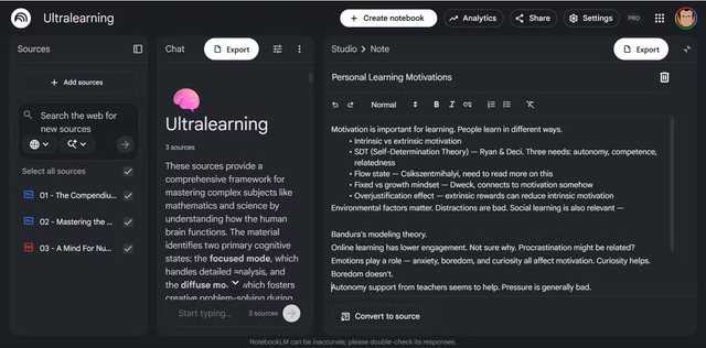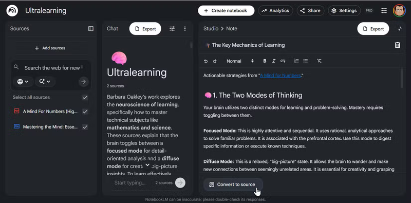 NotebookLMでは、**メモパネルに直接書き込み、ワンクリックでそのメモを完全な「ソース」へと変換できます**。変換されたメモは、アップロードしたPDFやWebリンク、その他のドキュメントと肩を並べる存在になります。
