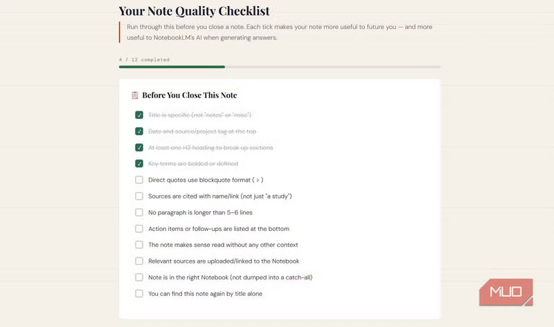 私は適切なノート作成のためのチェックリストを運用している(スクリーンショット参照)。これは、役立つノートをつくるための細かなポイントを思い出し、習慣化するのに役立つ。